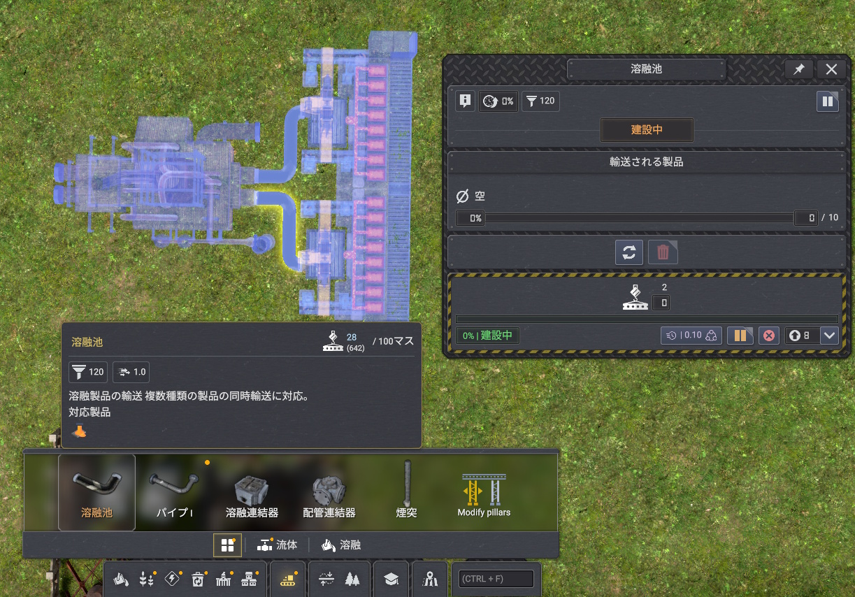 溶鉱炉から産出された溶融鉄は鋳造施設に搬入する必要があるので、溶融鉄を輸送できる溶融池で溶鉱炉と鋳造施設をつなぎます。溶融池は下のメニュー中央のベルトコンベアのアイコンから選択できます。