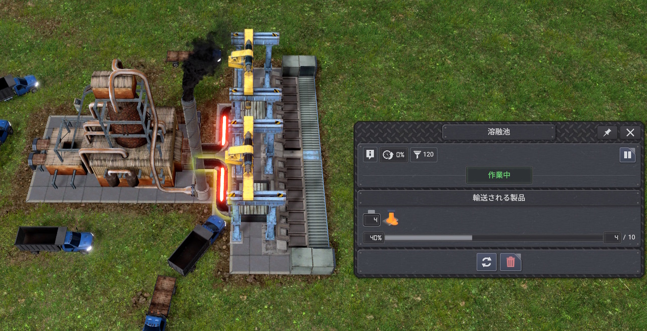 鋳造施設に溶融鉄が流れ込み、ここで成形されて鉄板ができあがります。本作を遊んでいるとカメラを寄せて施設のアニメーションをじっくりと見ることはあまり多くありませんが、こうした細かなアニメーションも見応えがあります。