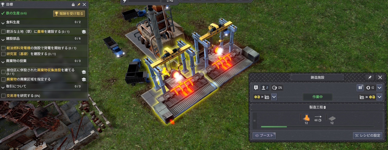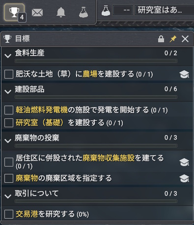 目標はこれまで「鉄の生産」の他に「食料生産」があるだけでしたが、「鉄の生産」を完了したことで新たな目標「建設部品」「廃棄物の投棄」「取引について」が追加されました。