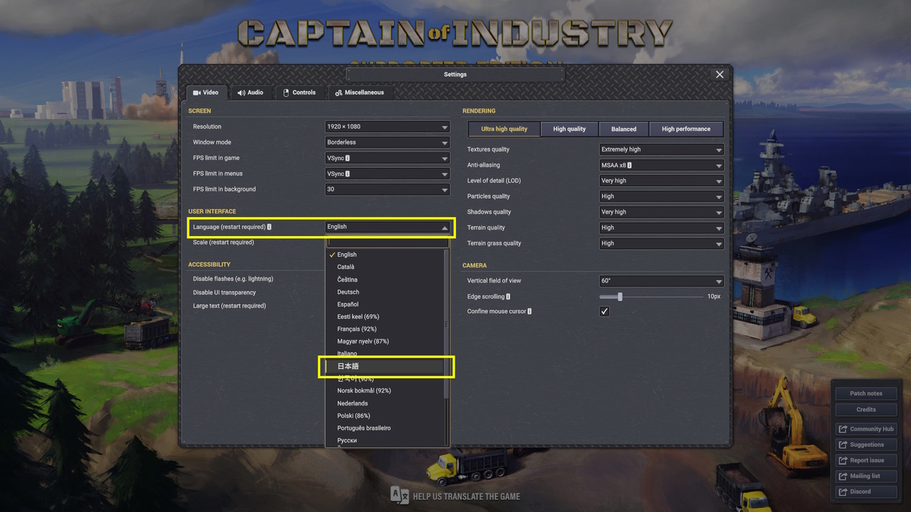 設定メニュー左側中ほどの「Language」で「English」となっているプルダウンメニューをクリックし、「日本語」を選択します。言語設定は適用にゲームを再起動する必要があるので、設定メニューを閉じ(右上の「×」ボタン)、メインメニューの「Quit」をクリックしてゲームを終了し、再起動します。