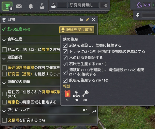 画面左上には目標が表示されていますが、これが本作の事実上のチュートリアルです。目標は表示されている達成条件をすべて達成すると完了でき、完了ボーナスとして資源を獲得することができます。
