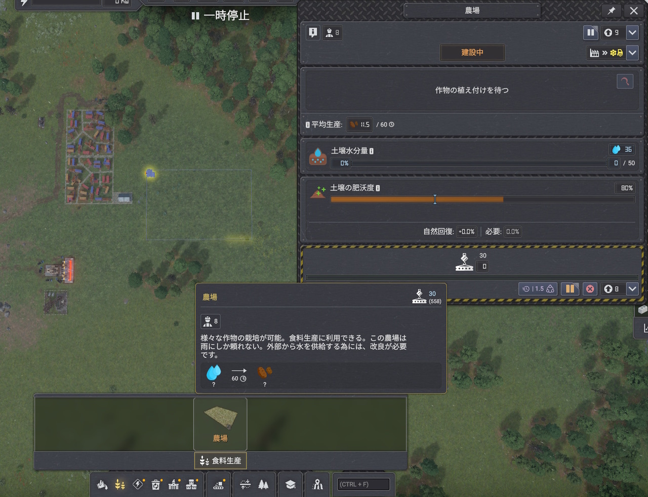 まず農場を建設します。食料は住宅に隣接して最初から建てられている食品市場に搬入されることで市民に供給されますので、農場はここに近いところに建てるのがよいでしょう。