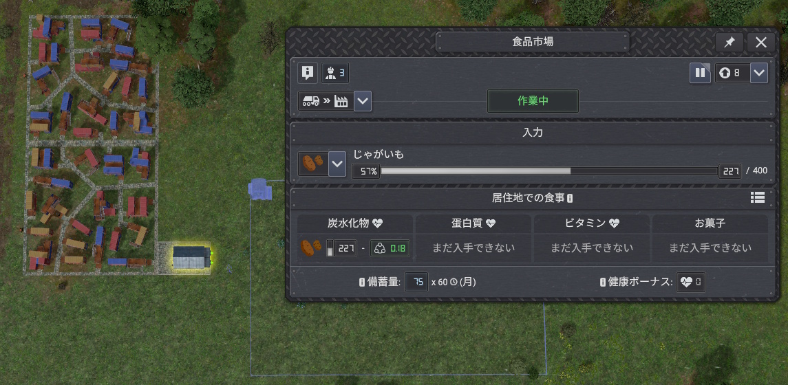 時間を進めて農場でじゃがいもの初収穫があれば、目標「食料生産」は完了です。じゃがいもは収穫まで順調に行っても3か月かかる上、初期の農場では土壌水分量が不足することがあるため、収穫までに半年近くかかる場合もあるかもしれません。気長に待ちましょう。