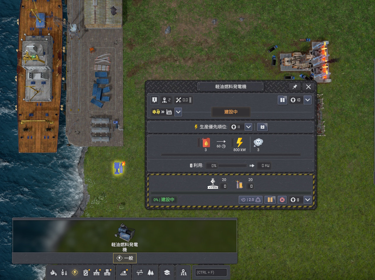 まず文字どおり軽油燃料を使用して電力を作る軽油燃料発電機を建設します。軽油燃料は序盤では造船所にあるものを使うので、軽油燃料発電機は造船所の近くに建てるのがよいでしょう。