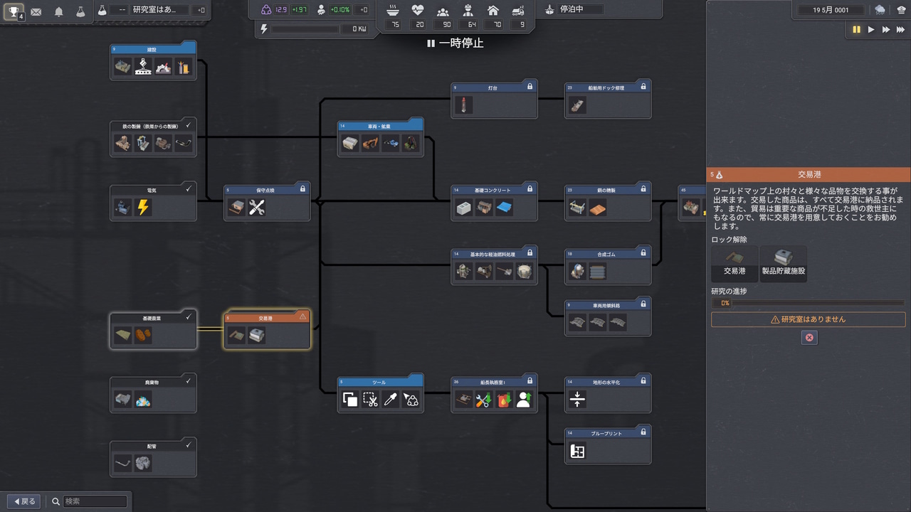 最初に「技術『交易港』を研究する」とあるので、先に目標「建設部品」で行う軽油燃料発電機と研究室(基礎)の建設を進めておきます。研究室(基礎)が完成して研究できるようになったら、画面左上の「研究開発無し」をクリックするか、研究室(基礎)の詳細画面の「新しい研究を開始する」ボタンして研究画面を開き、技術「交易港」をダブルクリックするか、技術「交易港」をクリックして右側の「研究を始める」ボタンをクリックして研究を始めます。