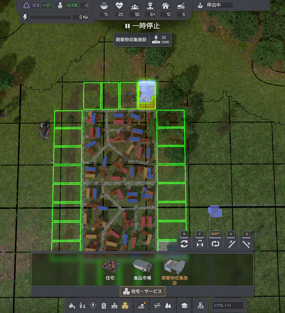 まず廃棄物収集施設を住宅に隣接して設置します。下のメニューで廃棄物収集施設をクリックすると、住宅の周囲に緑色の四角がたくさん出てきますが、廃棄物収集施設や食品市場のような住宅にサービスを提供するタイプの施設はこの緑枠の中にしか建設できません。