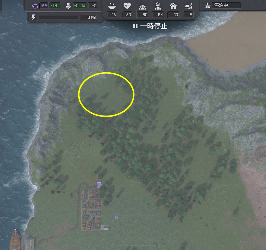 収集した廃棄物は、序盤は別の場所に投棄するしかありません。投棄場所は住宅や生産施設からは少し離れた場所がいいでしょう。というのは、住宅や生産施設は今後建て増しが考えられるためです。一方、あまりに遠いと廃棄物投棄にトラックを長距離走らせなければならず、効率がよくありません。少し離れていて、今後あまり施設を建てることにならなそうな場所が投棄場所として適切です。今回は上の画像の黄色の丸のあたりを投棄場所とすることにします。