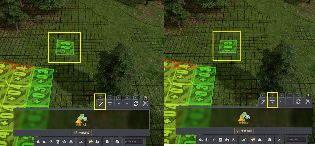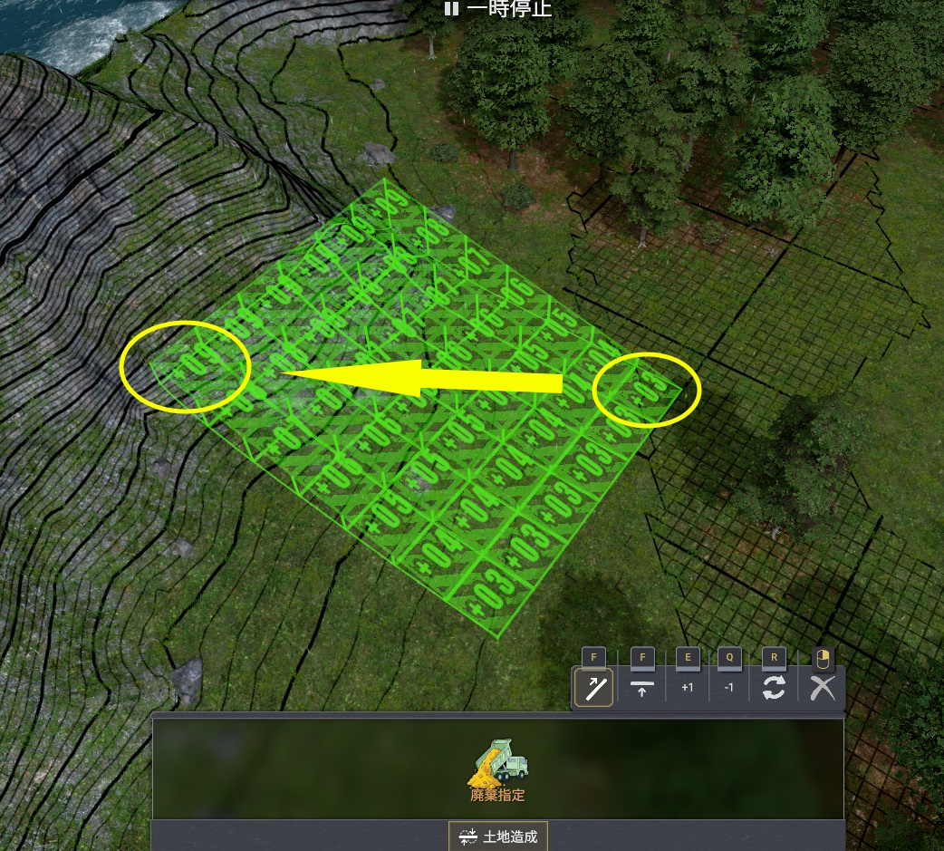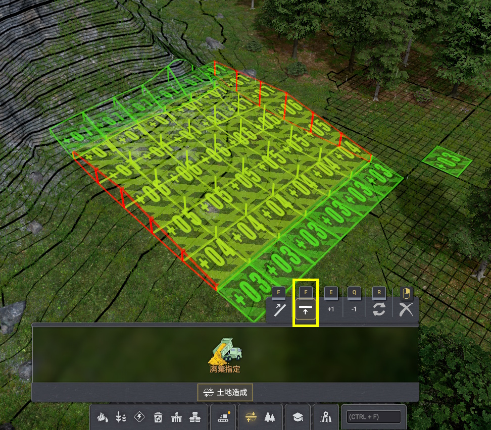 まず画面下のメニューで廃棄指定をクリックし、[F]キーを押してスロープ状に指定できる状態に切り替えます。下のメニュー上部右側に現在の指定形態がスロープであるか平面であるかが表示されていますし、マップ上でもスロープ状の場合は坂になっているのがわかると思います。