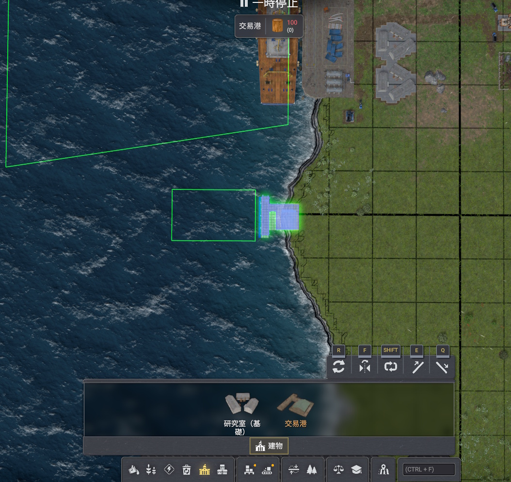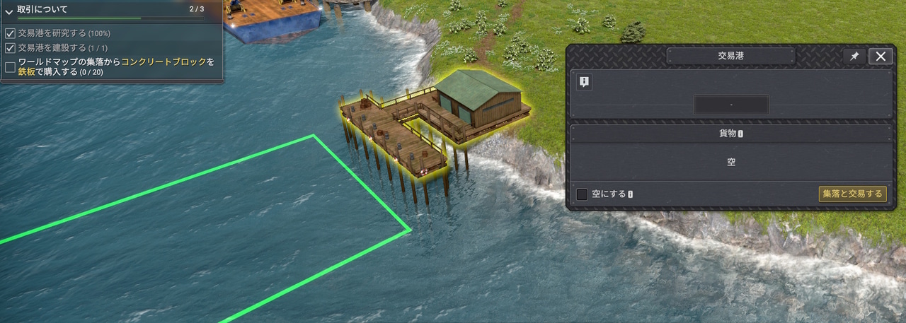 時間を進めて技術「交易港」の研究が終わると、交易港を建設できるようになります。交易港は海に面して建設する施設で、交易港前方の緑枠内は障害物が存在しない海である必要があります。資源を運び入れたり運び出したりする場所なので、生産施設や住宅からあまり遠くない場所に設置するほうがよいでしょう。