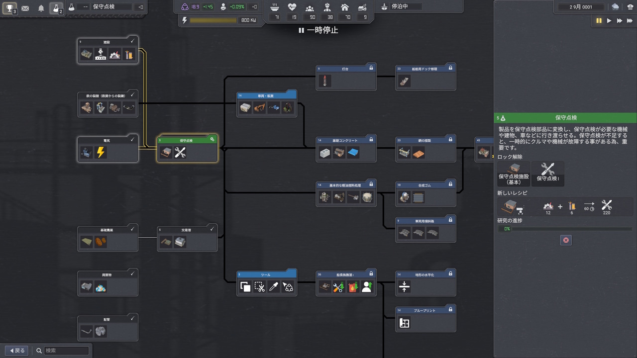 研究が完了すると、保守点検施設(基本)が建設できるようになります。これは機械部品と電子部品を原材料として、保守点検を産出する施設です。ここで出てきた機械部品と電子部品はこれまで登場してこなかった資源です。どのように調達すればいいのでしょうか?