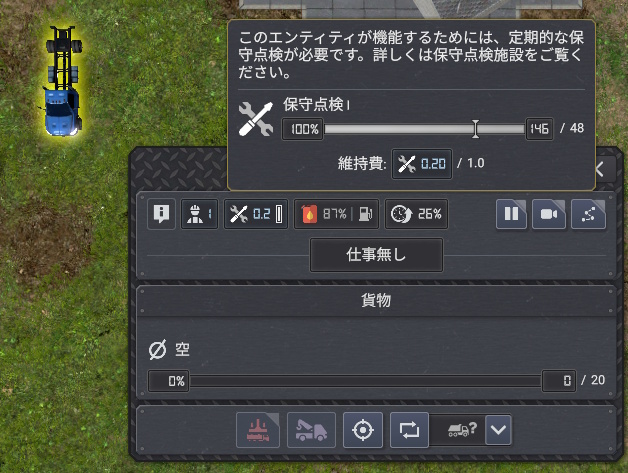 保守点検とは車両や施設が稼働する際に消費する仮想的な資源で、これが不足すると車両や施設の機能が低下(難易度「キャプテン」以上では故障して機能停止)します。電力・食料・軽油燃料と並んで特に重要な資源のひとつです。