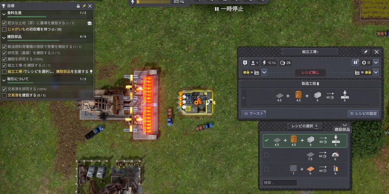 組立工場Iの建設が完了すると、ここで建設部品を生産するという達成条件が提示されます。組立工場Iの詳細画面右下にある「レシピの設定」から建設部品のレシピを選択しましょう。原材料は鉄板・木材・コンクリートブロックで、鉄板は溶鉱炉からつながる鋳造施設から、木材は小型樹木伐採機から、コンクリートブロックは廃墟となった通信局から得ることができます。