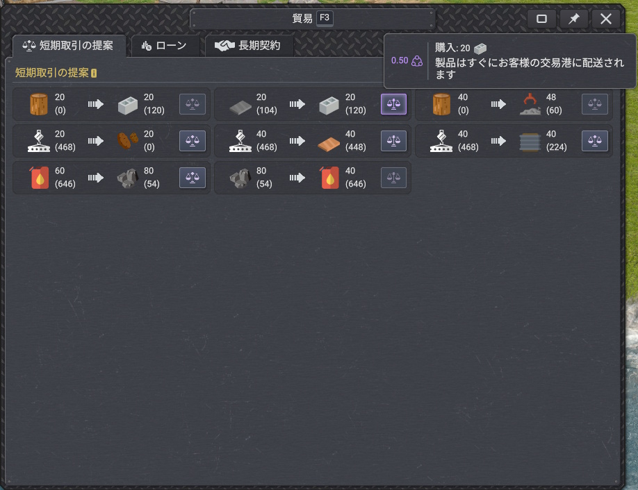 特に資源生産の少ない序盤はこの短期取引や、目標としては出てこないであろうローン(資源の借り入れ。上の画像に「ローン」というタブがあります)をうまく使うことで開発を加速させられますし、経済運営に失敗して窮地に陥っても立て直せるかもしれません。