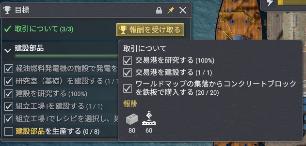 これで目標「取引について」が完了し、ボーナス資源を獲得します。