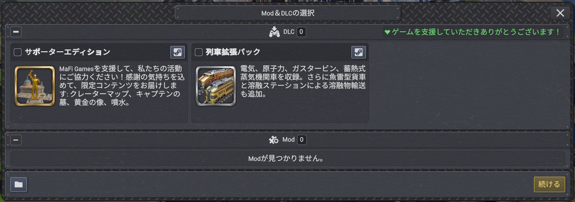 メインメニューの「新しいゲーム」をクリックすると、ModとDLCの選択画面が表示されます。本記事で取り上げる範囲までのゲームにはサポーターエディションと列車拡張パックのいずれも影響しないはずですが、以下ではすべて外した状態で進めていきます。右下の「続ける」をクリック。