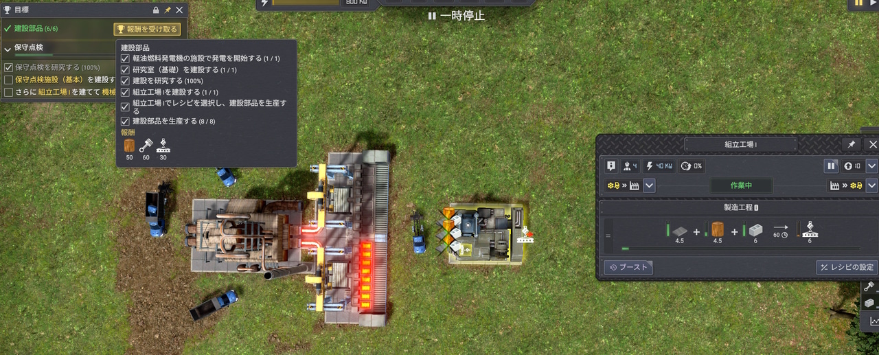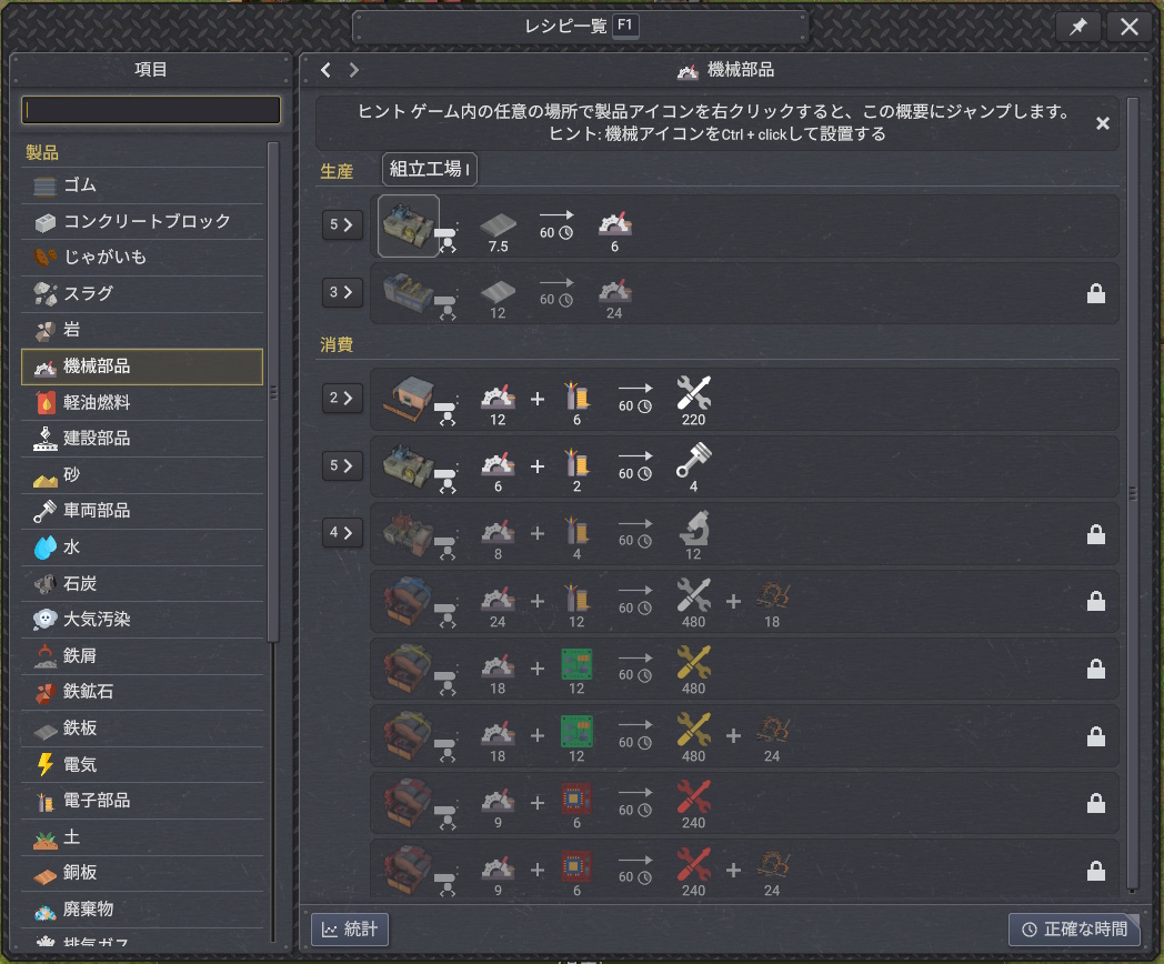 なお、達成条件には入っていませんが、保守点検施設(基本)で使用するもうひとつの資源である電子部品も組立工場Iで生産できます(先ほどの機械部品の生産方法を確認したときと同じ方法で確認できます)ので、もう1棟組立工場Iを建設して電子部品の生産も始めておきます。このあたりから目標の達成条件がプレイヤーの自立を促すかのように少しずつ不親切になっていきます。
