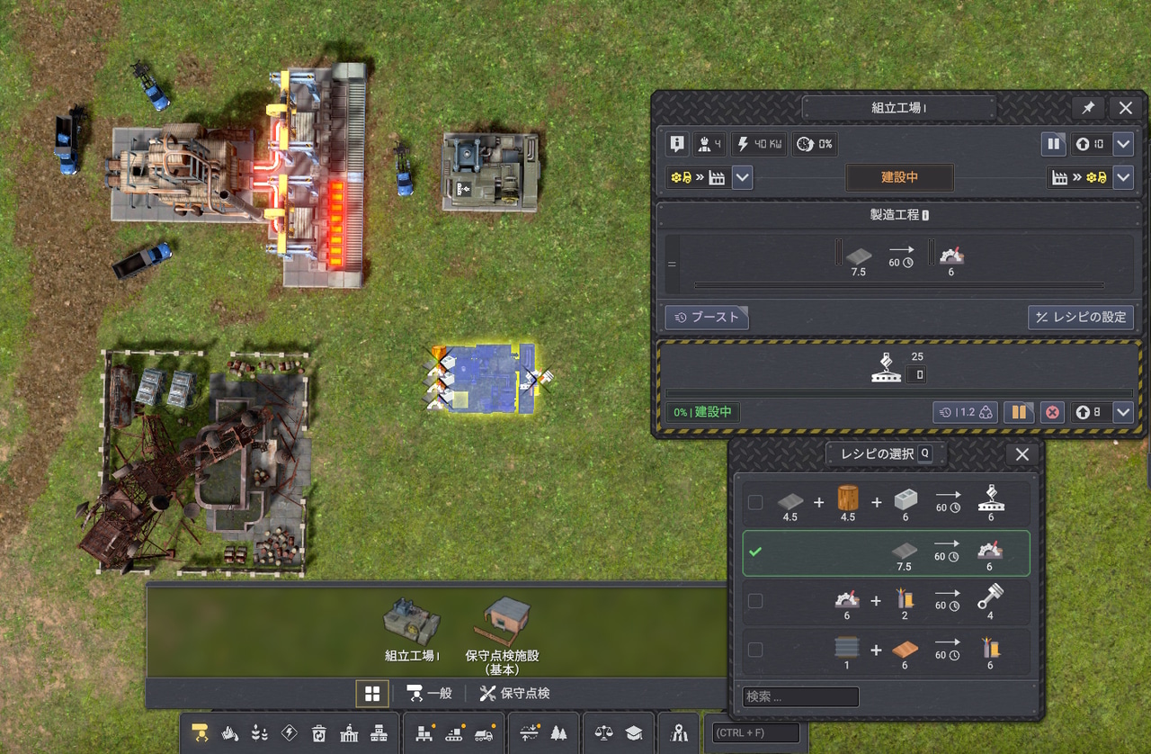 そこで、目標の達成項目としては順番が前後しますが、保守点検施設を建設する前に、組立工場Iを建設して機械部品を生産するレシピを設定します。
