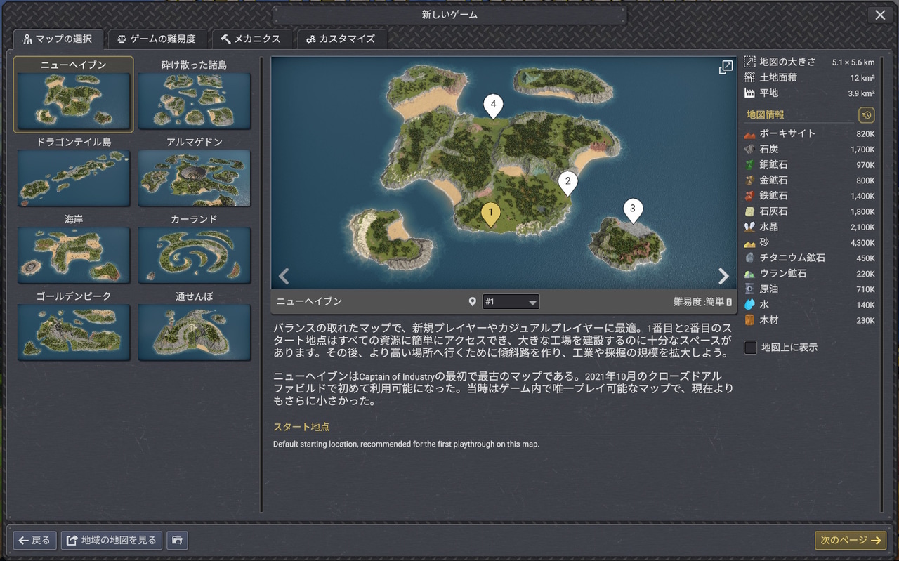 ここではマップや難易度などのゲーム設定を決めていきます。まずマップですが、今回はデフォルトの「ニューヘイブン」を選択します。画面中央の説明に「新規プレイヤーやカジュアルプレイヤーに最適」とあるように、もっとも癖のないマップです。選択したら右下の「次のページ」をクリックします。