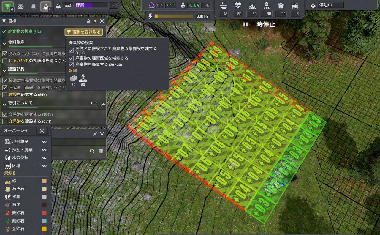 目標はこれまで「鉄の生産」の他に「食料生産」があるだけでしたが、「鉄の生産」を完了したことで新たな目標「建設部品」「廃棄物の投棄」「取引について」が追加されました。