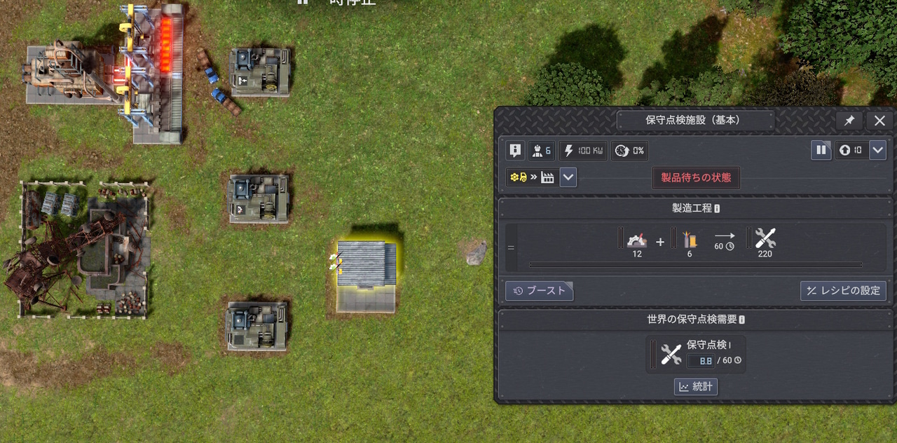設置した炭窯や煙突をクリックすると、炭窯の現在の状態が表示されます。本作では施設が稼働するにはまず施設が建設される必要があり、現時点では設置場所を決めただけなので、当然ながら建設は行われていません。ここでスペースキーを押して、ゲーム内時間を進めてみましょう。