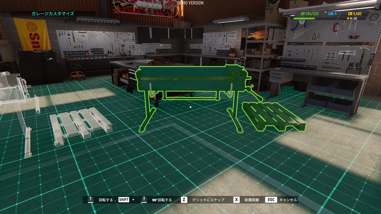 前作では決まった場所から動かせませんでしたが、「2026」ではプレイヤーが購入した作業台などを自分でガレージ内に配置する形式となりました。上の画像のように斜めの配置も可能です。本作ではさらにお金をかけてアップグレードできる設備もあります。