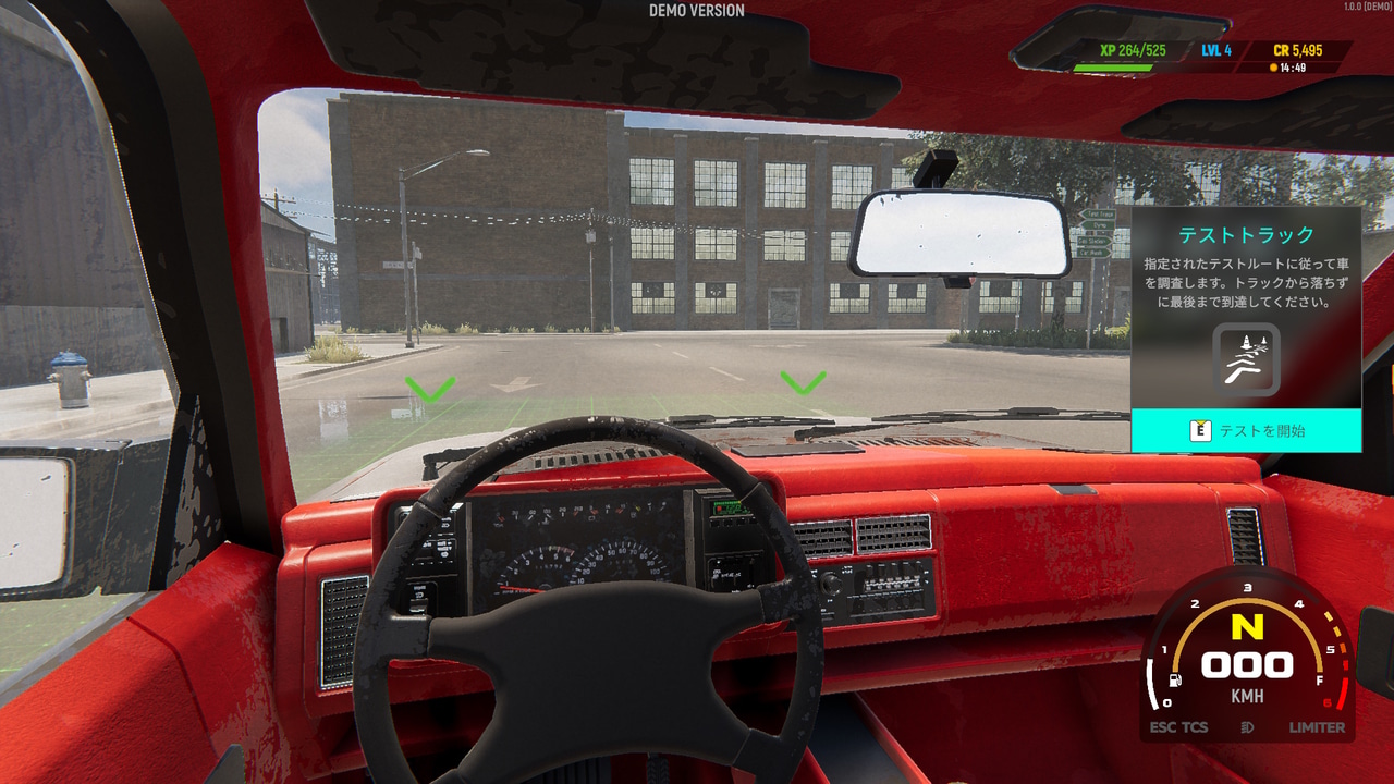 デモ版だからということなのかもしれませんが、テストトラックとしてガレージ周辺の道路を一周する形式となりました。最初からプレイヤー所有の車両としてボロボロのピックアップトラックがあるので、おそらくジャンクヤードなども自分の車で向かう形式(もちろんボタンひとつで移動できる方法もできるものと思いますが)になるようです。なお、自分の車がない場合は公衆電話でタクシーを呼んで移動することもできると説明されていました。