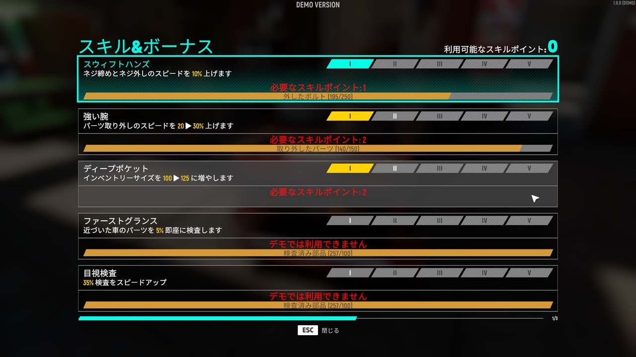 レベルアップするとスキルポイントがもらえるというのは前作と同じですが、スキルは少し変更されています。前作ではプレイヤーが無限にパーツを所持できましたが、本作では上限(初期状態では75)があり、スキルポイントで上限を引き上げることができるようになっています。プレイした感じではこれがけっこう重要に感じました。上限を超えたパーツはガレージ内のキャビネット(これも追加で購入して配置できます)に保管できます。