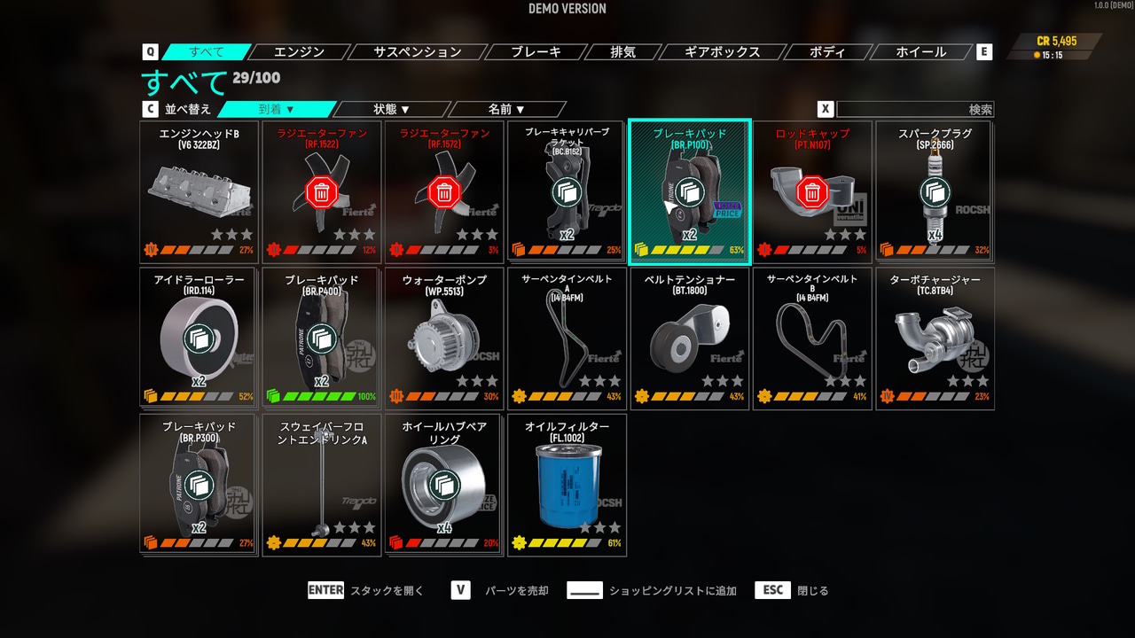 インベントリー画面。本作では同じ種類のパーツはまとめて表示されるようになりました。これは多くの種類のパーツを見ることができますが、まとめられたパーツはクリックして詳細表示しないと具体的にどれくらいのコンディションのパーツを持っているのかわからないので、一長一短という印象です。上に書いたようにパーツの所持上限ができたのも、やりくりの面倒さを感じました。