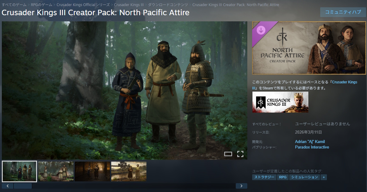 2026年3月5日、「Crusader Kings III」新DLC「North Pacific Attire」「East Asian Wonders」「Celestial Court Attire」発売は3月11日と発表されました。