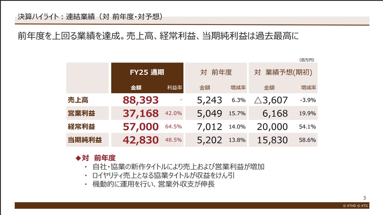 売上は業績予想未達でしたが、第4四半期に集中的に発売された新作の販売によって、売上・営業利益は前年度比増加。さらに、コーエーテクモHDのお家芸とも言える資産運用がうまく行ったことで、経常利益以下も大幅に増加しています。決算発表直前に発表された業績予想の上方修正後の予想値から、さらに小幅の上振れがあった着地となりました。これは業績予想は費用を保守的に織り込んでいるためということが決算説明資料で述べられています。