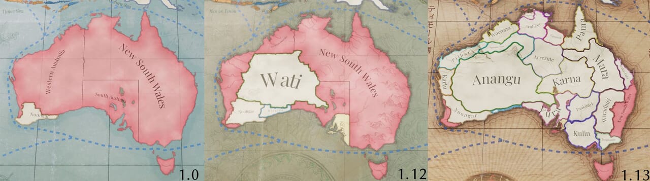 - 私たちはMod「Anno 1836」の制作者crownsteler氏から連絡を受け、機会があれば自分たちのマップ制作の協力を要請された。その後彼らと協力し、Mod「Australia & New Zealand Flavor Pack」の制作者も含めてより洗練された形でオーストラリアを改良した。パプア人の場合と同じく、「Victoria 3」のゲームシステムでアボリジニの多様な文化・言語を再現するのは難しく、言語や地理的条件を基準として複数の民族を統合せざるを得なかった。さらに、キャンベラは廃止された。