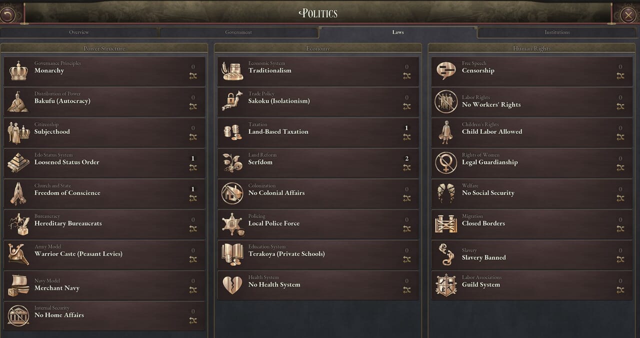 - 日本はこれまで初心者向け国家とされてきたため、史実ルートを進む場合は初心者向けのままであるように心がけた。