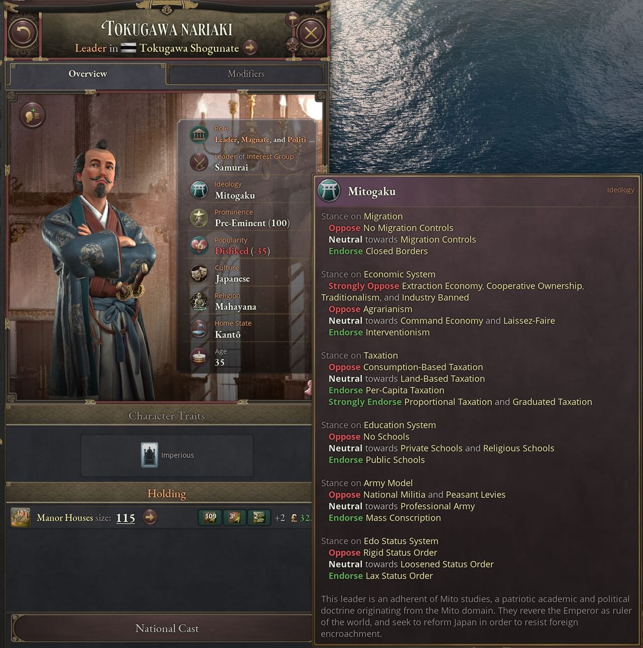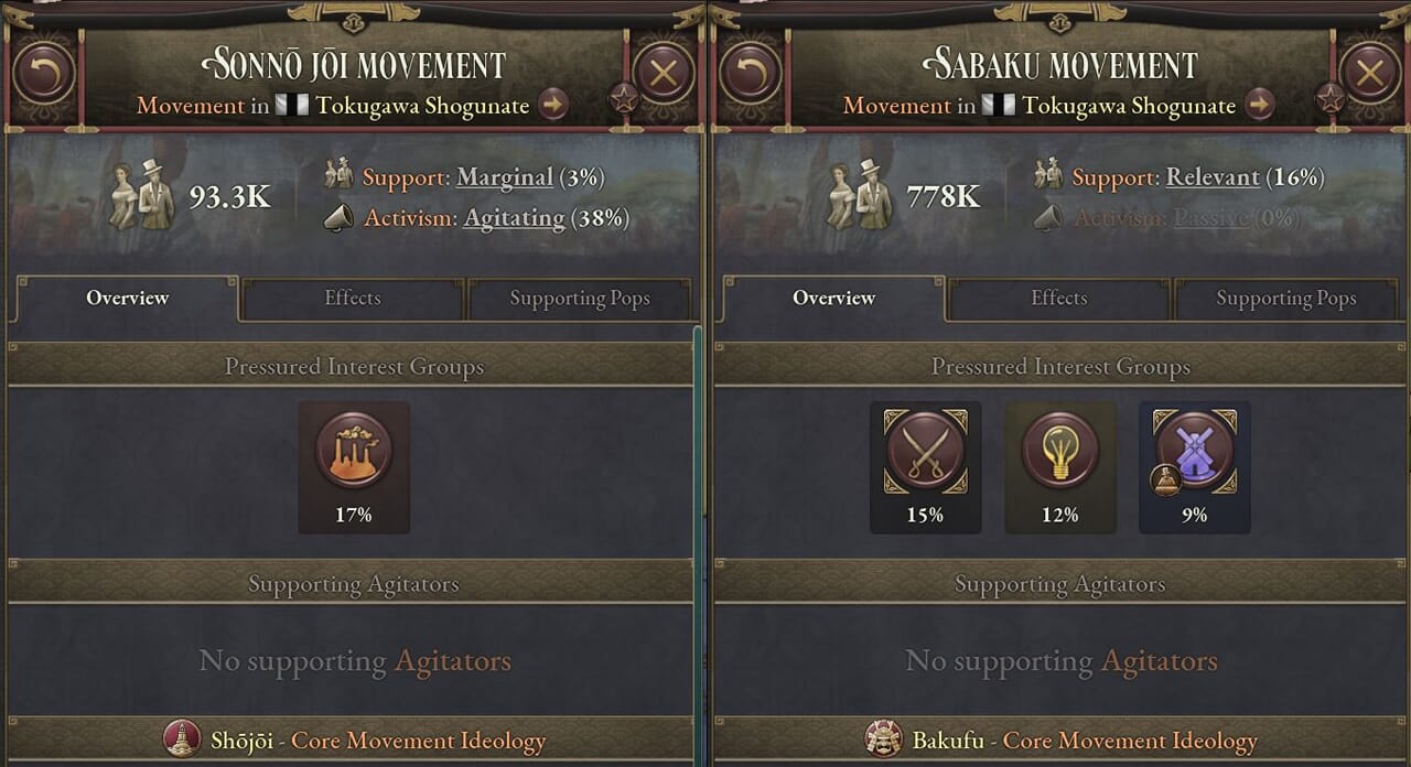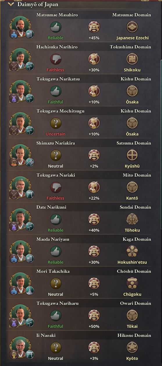 - そうした社会的支持以外に、各藩の大名の忠誠度も彼らが支持する運動に影響する。この時代には史実では200以上の藩があったが、ゲーム内では特に富裕かつ影響力の大きい藩を選んでいる。