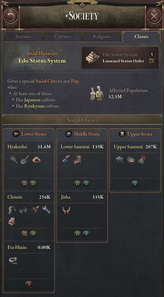- 日本の江戸身分制では武士階級が著しく優遇され、労働者も資本家も下層階級に属し、受容度を上から二番目に制限している。身分制度は強化されることも緩和されることもあり、明治維新で廃止されることもある。