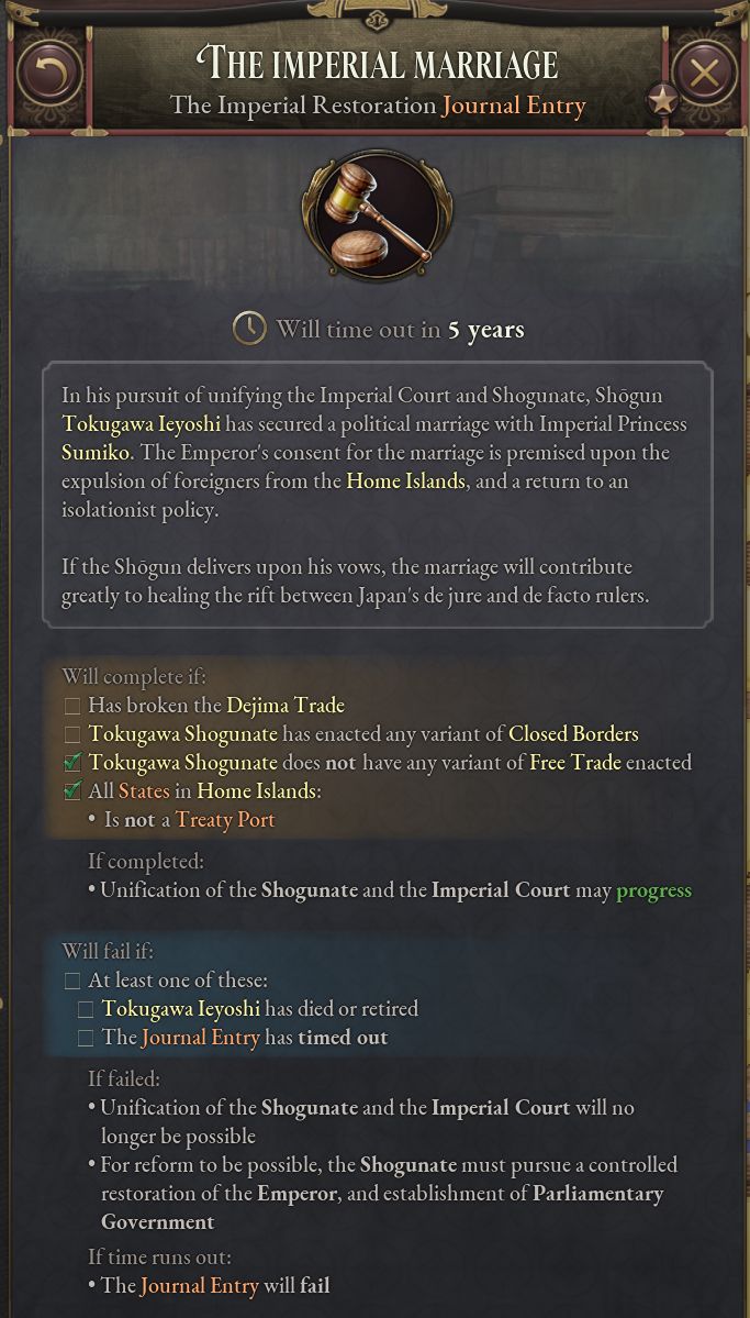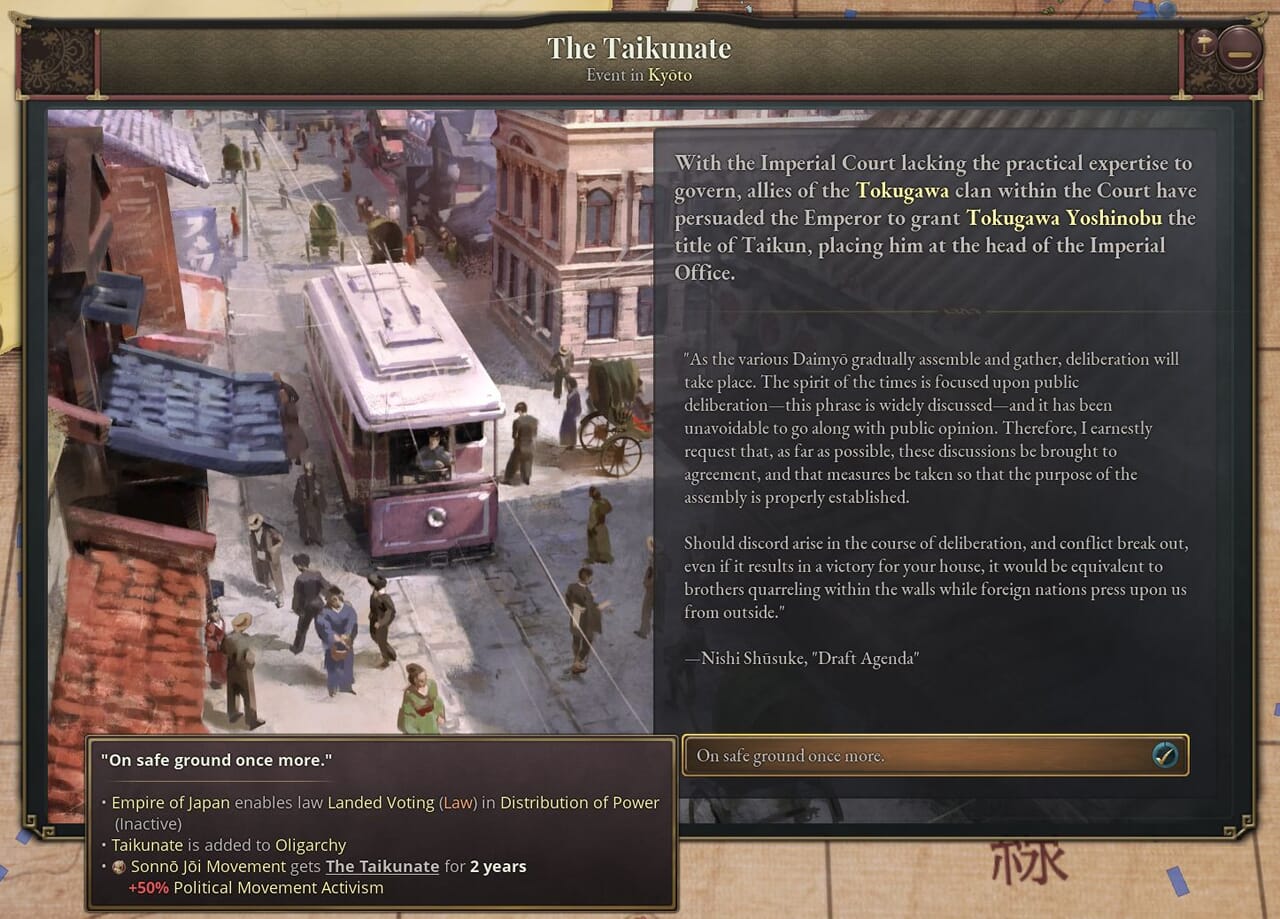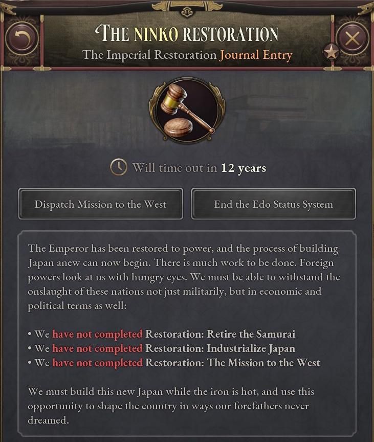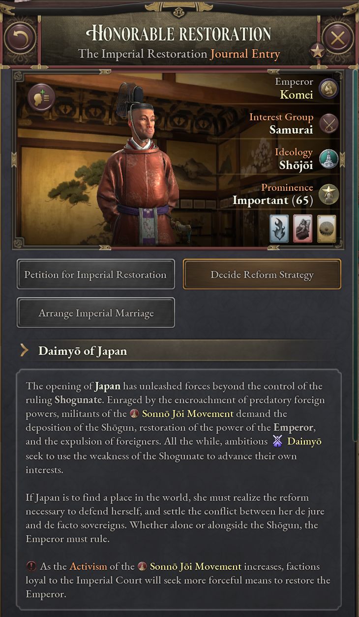 - 「名誉ある復古」は史実の1853~68年までのできごとをまとめたものだ。このジャーナル記事が有効である間、プレイヤーは次第に過激化する尊王攘夷運動に対処しつつ、天皇と将軍の緊張関係を解決する方法を探る。