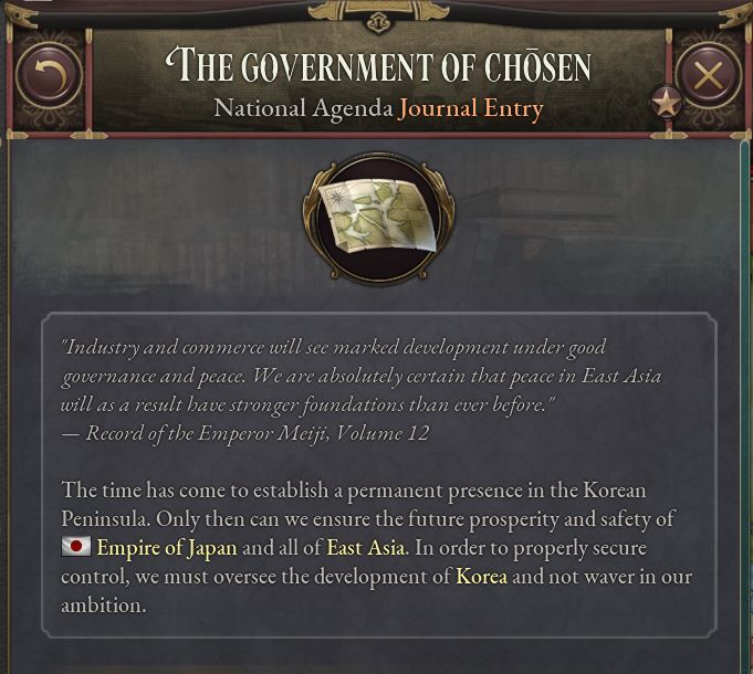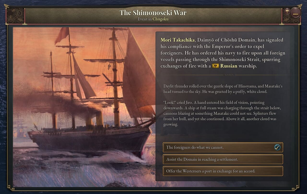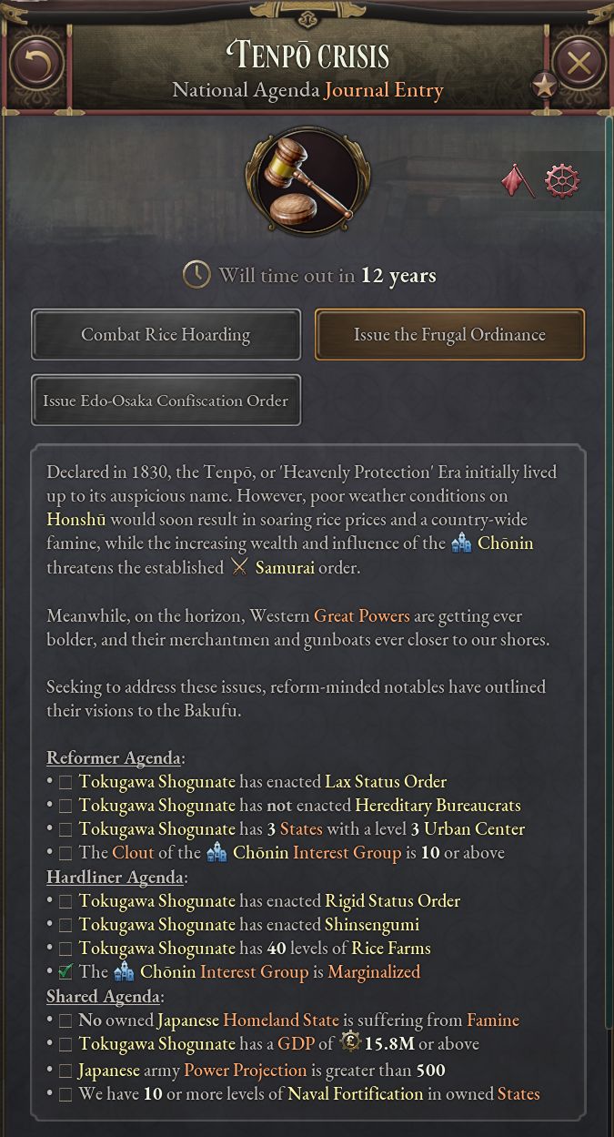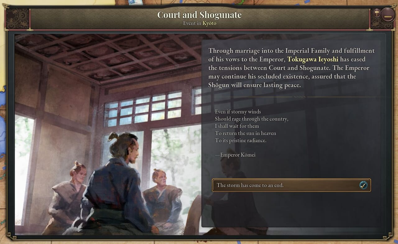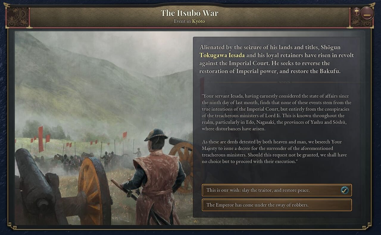 - 「名誉ある復古」は史実の1853~68年までのできごとをまとめたものだ。このジャーナル記事が有効である間、プレイヤーは次第に過激化する尊王攘夷運動に対処しつつ、天皇と将軍の緊張関係を解決する方法を探る。