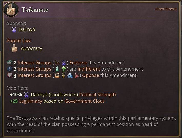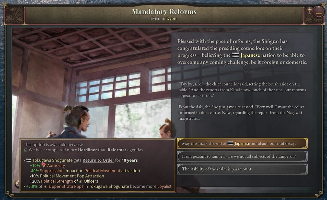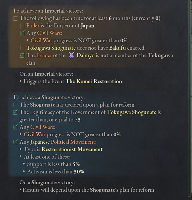 - 最後の史実の結末には、幕府の正当性が低いときに大政奉還を行うか、通常の立法手続で幕府法を廃止することで進める。史実でそうだったように、このルートも内戦を引き起こす可能性が高い。