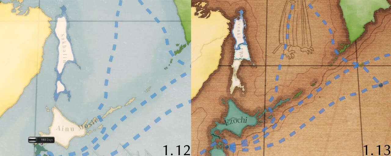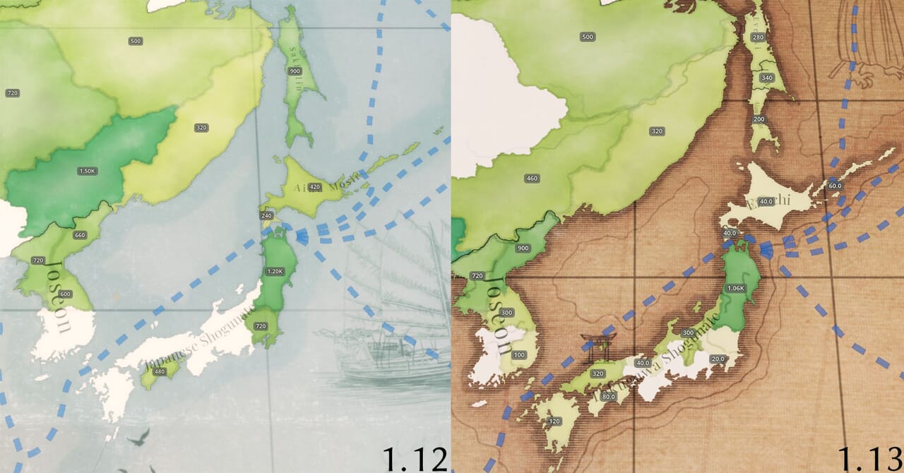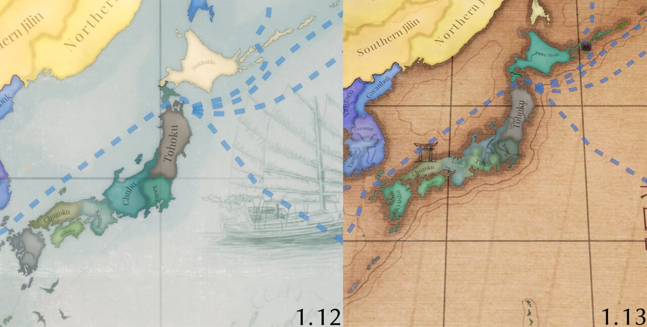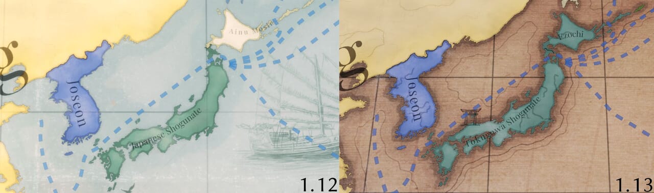 - 海軍システムの変更に合わせて海域の配置も見直し、戦略的要所や沿岸部は海域の密度を高めた一方、外洋は統合した。移動ルートを決定するスプラインネットワークも更新した。
