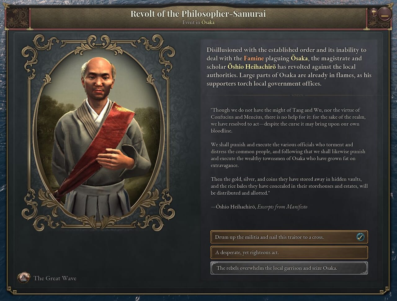 - このジャーナル記事が有効である間、大塩平八郎の乱などの当時の日本を揺るがした事件に関するイベントが発生する。