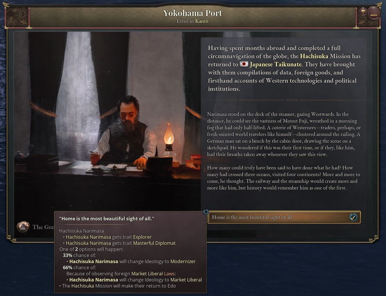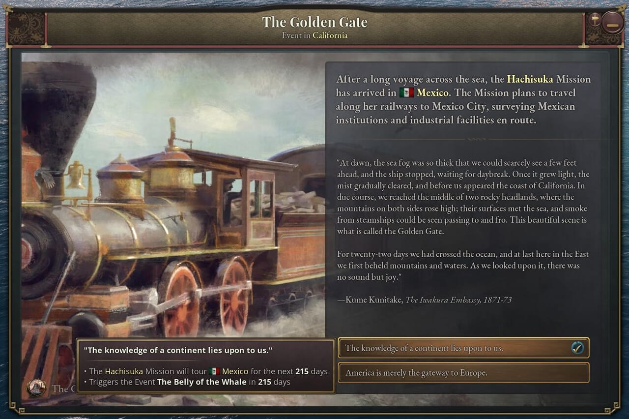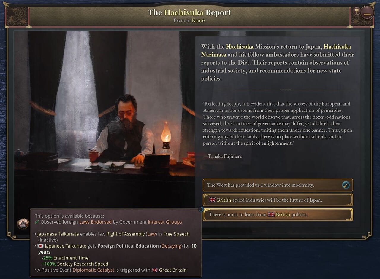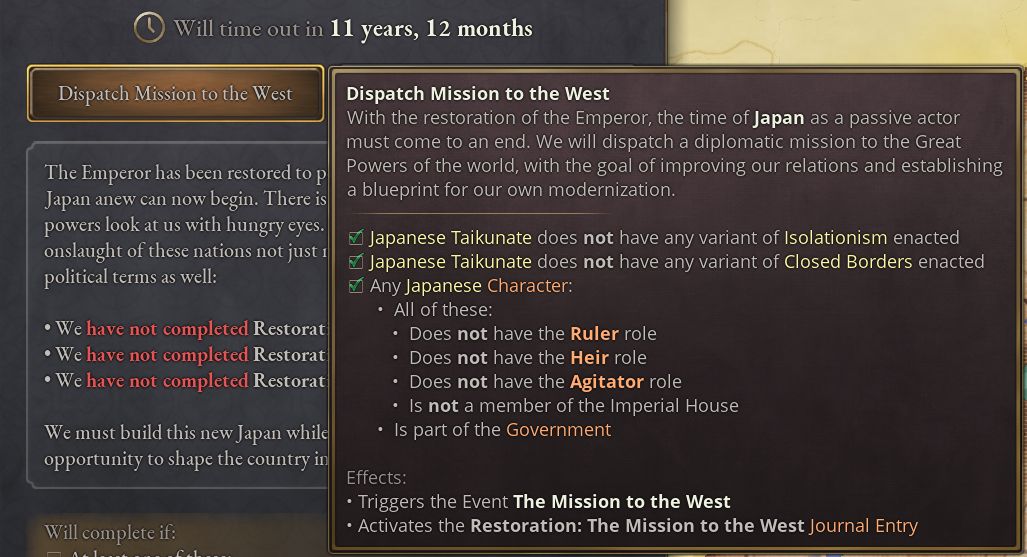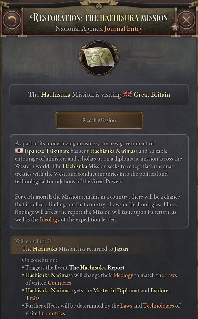 - 西欧派遣使節団を出発させるにあたって、どの人物を団長とするか選択できる。使節団は外国滞在中にその国の現行法や技術に関する情報を収集する。その国が魅力的な法体系を持っていたり、高い開発水準にある場合、使節団を長期間滞在させたいと思うかもしれない。