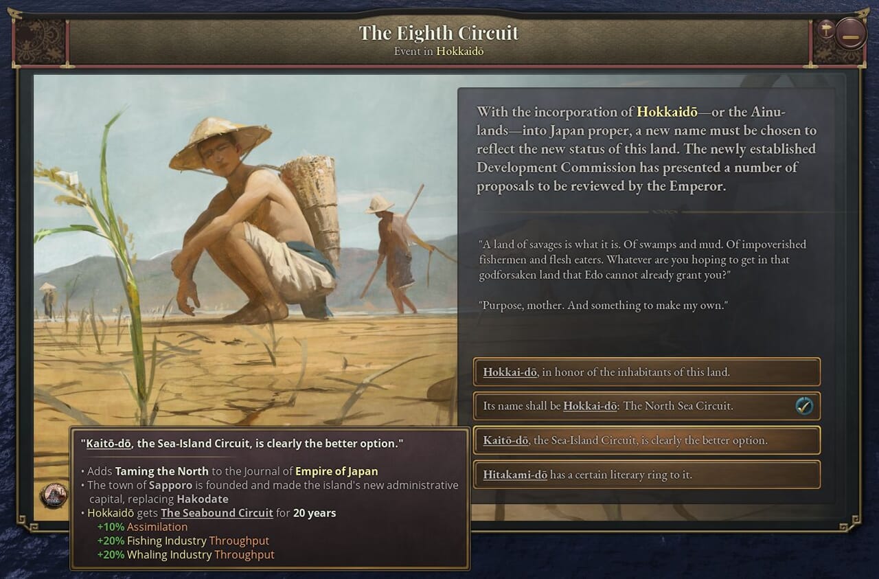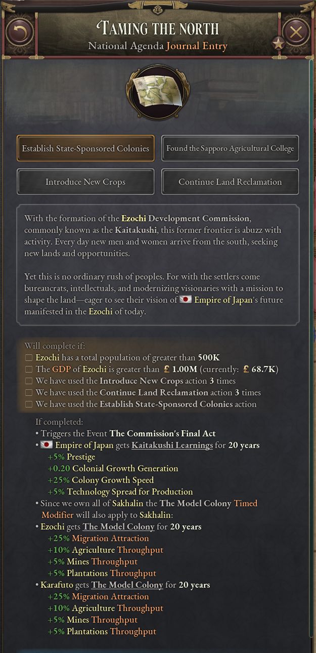 - 蝦夷地を完全に領土に編入し、ある程度の開発を始めると、ジャーナル記事「北辺鎮撫」を得る。このコンテンツでは北海道を農業・鉱業生産で東北に引けを取らない土地に変貌させる過程を描く。