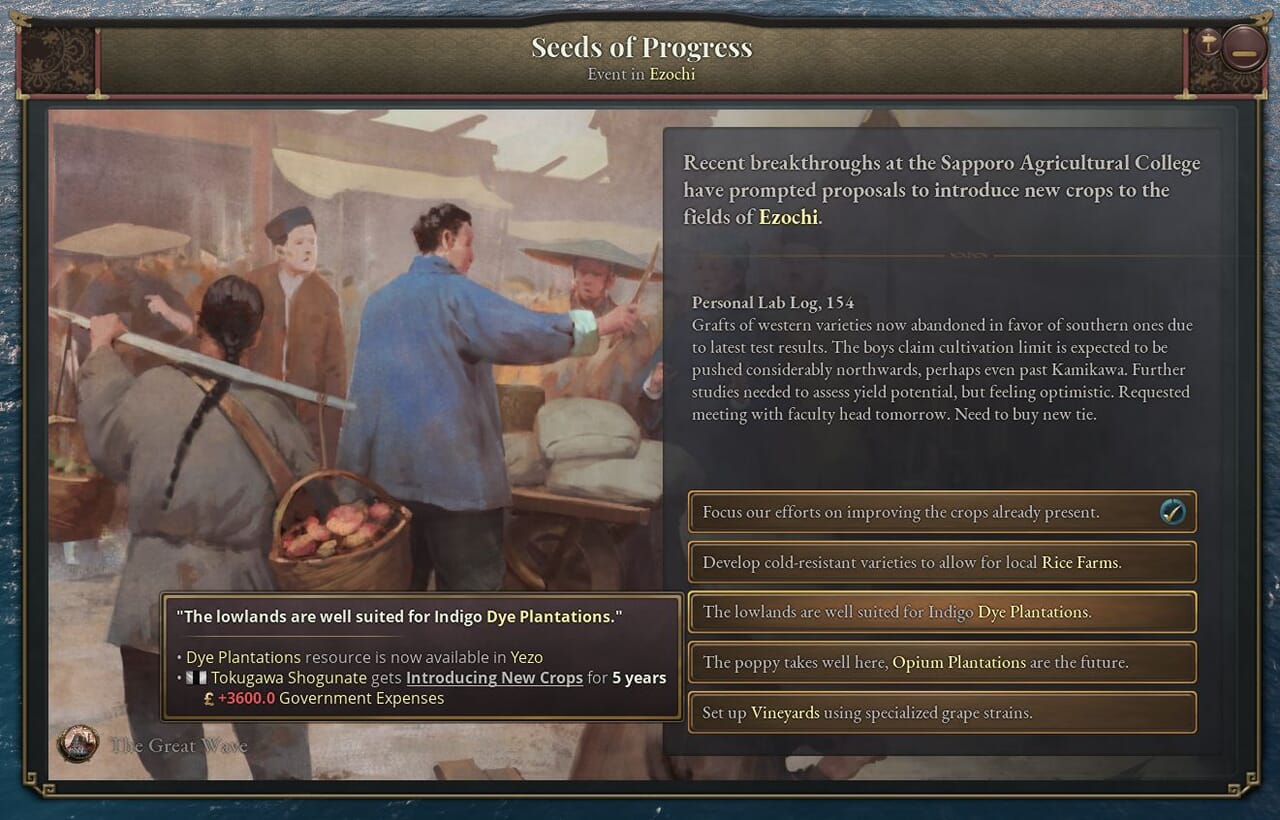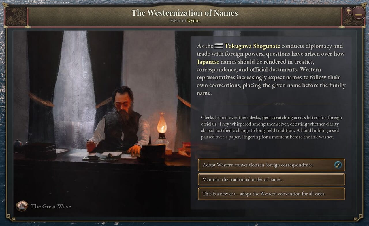 「Victoria 3」開発日記#179が公開されていましたので、その内容をご紹介。今回は「The Great Wave」の物語コンテンツについて。1.13リリース前の開発日記です。