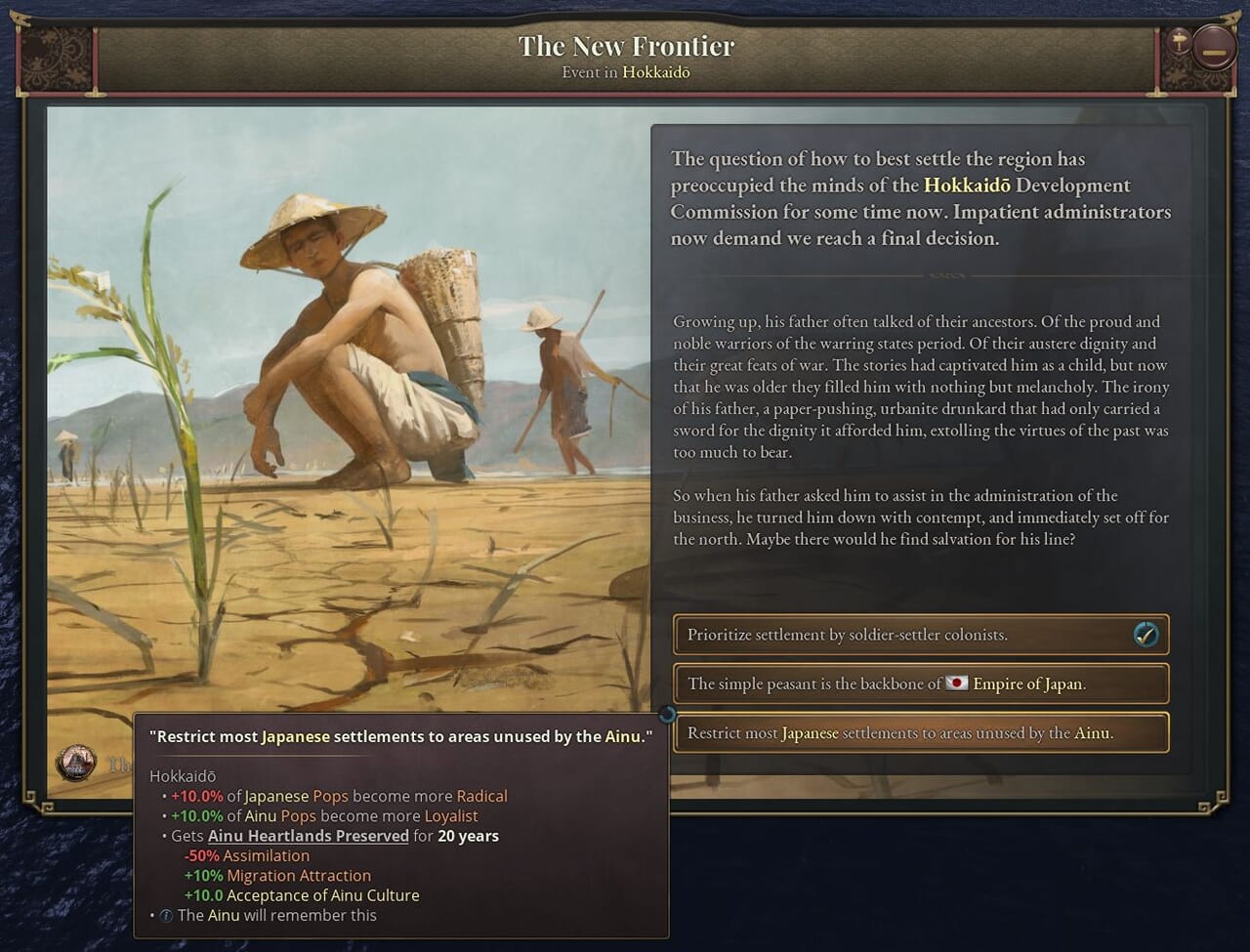 - この方法は時間と労力を要するが、開拓を進めて耕作可能地を拡大し、米やアヘンなどの新たな作物を導入し、日本人入植者を呼び込んで土地を開拓できる。先住民であるアイヌとの関係はプレイヤーの選択によって主に否定的な影響を受けるが、一定の譲歩の余地もある。