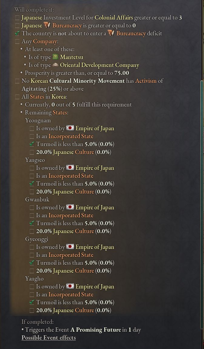 - 完了するには植民地企業の設立による朝鮮への支配権の確立、朝鮮半島の編入、朝鮮民族運動による騒乱と行動主義を抑制すること、先住民の同化政策を実施しなければならない。朝鮮の植民地化は完了に使った企業の大きな利益になり、日本の威信も高める。