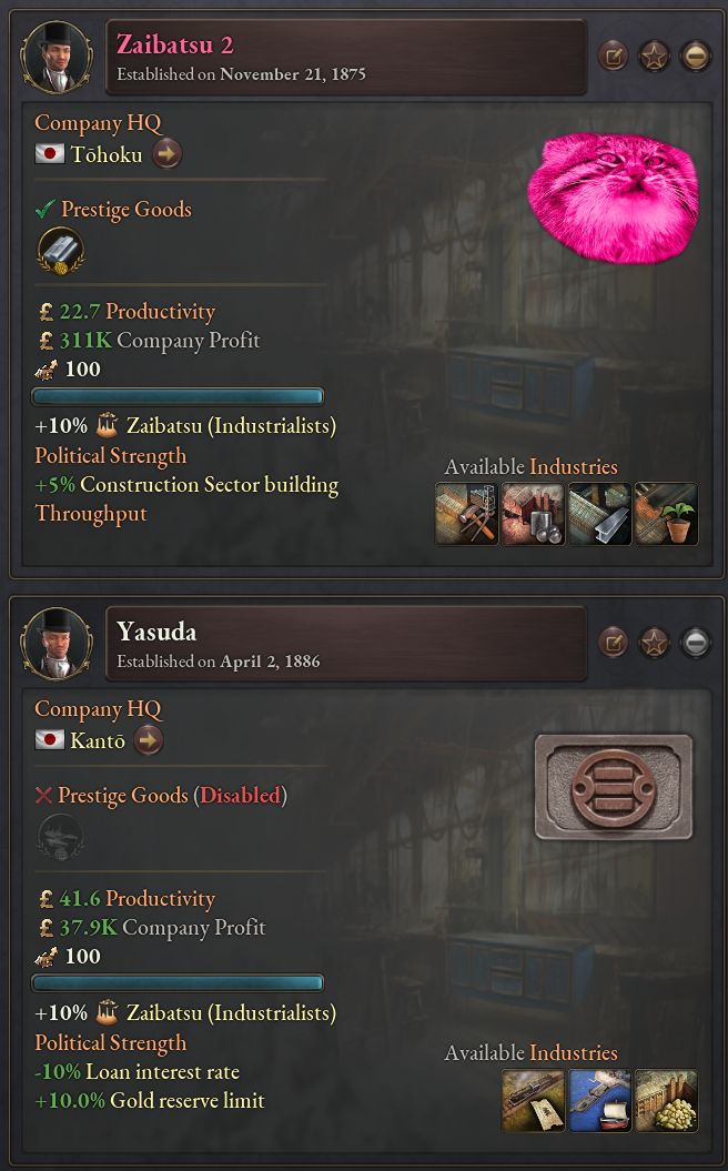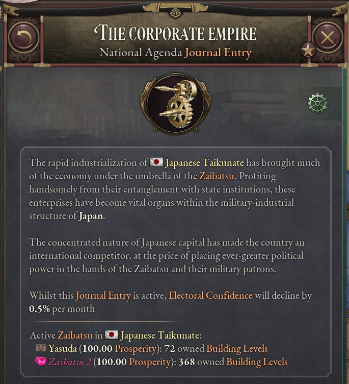- 「The Great Wave」では複数の企業が追加され、日本は最大4つの財閥を持つことができる。財閥は通常なら互いに競合せず、複数の財閥を形成した場合、経済のより大きな一部が財閥間で分配される。さらに、財閥の繁栄ボーナスは実業家に政治的影響力をもたらし、繁栄した財閥はその政治的代表者にとって大きな強みとなる。