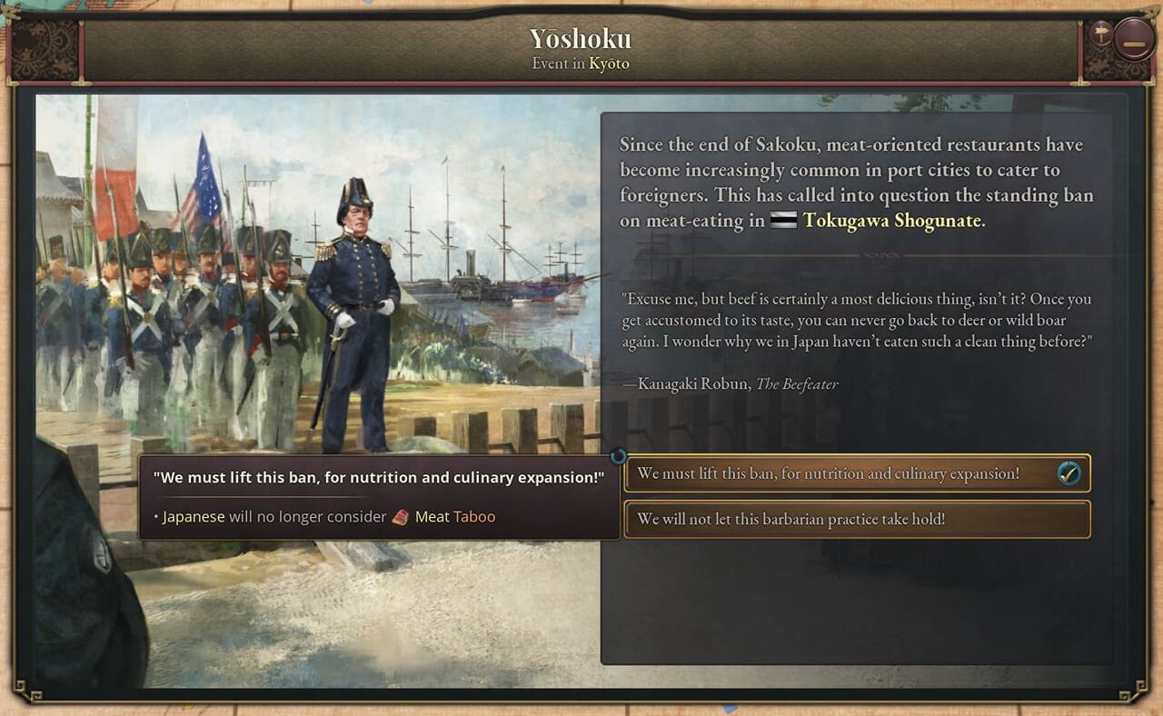 - 上記のほか、プレイヤーが日本としてプレイする際に起こる多くのイベントを追加した。史実の自然災害、西洋文化が日本社会に与えた影響、江戸時代の娯楽施設に対する日本政府の政策などが含まれる。