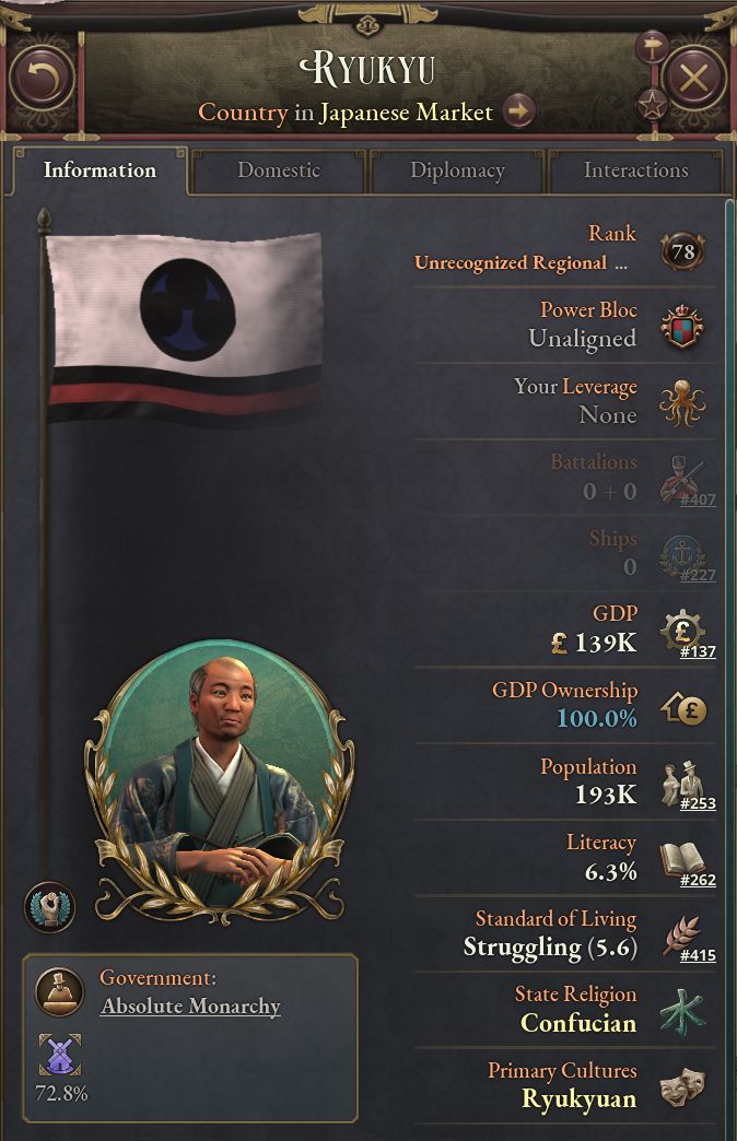 - 1836年に琉球は薩摩藩と清との間で板挟みになっている。砂糖生産が少し増え、自給自足農業や農奴制を解消できれば北東アジアで主要な砂糖輸出国となる。