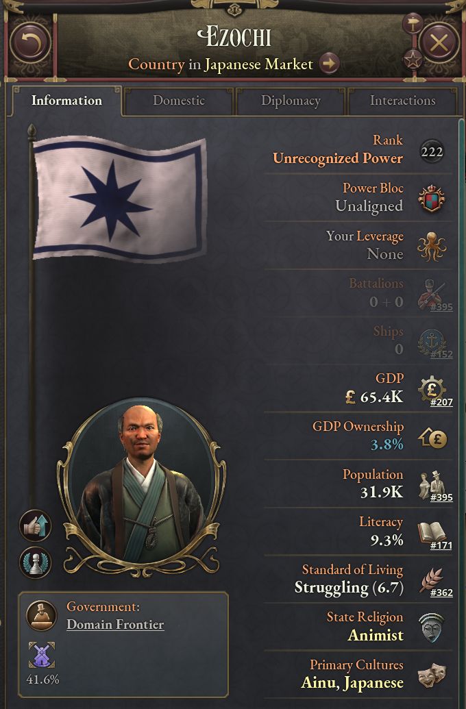 - 私たちは和人地を本土の一部とし、それ以外の北海道と南クリルを日本の従属国とし、アイヌ文化を持たせた。
